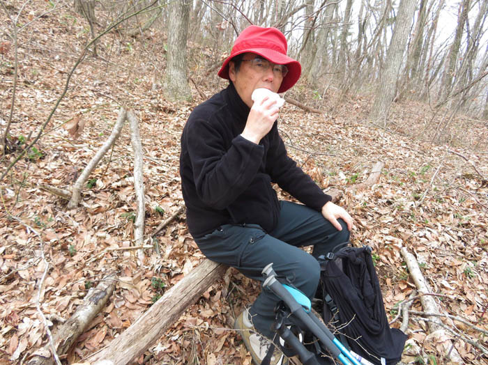 ありがたいことに、だんだん雲が流れて青空が多くなってきた。少し下った森の中の倒木に腰掛けておやつタイム。アンドーナツやクッキーを食べて元気回復。森が広いので、晴れて暖かければ居心地が良いだろうねと話しながら下りにかかる。