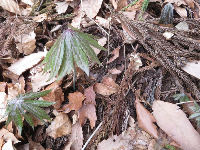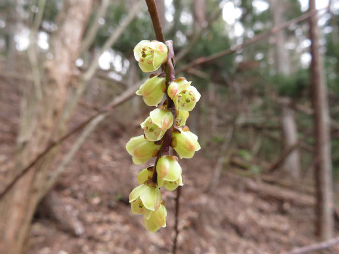 それでも帰り道は気持ちにゆとりがある。周囲の景色はまだ冬真っ盛りと言いたくなるけれど、それは間違い。一見茶枯れた世界だけれど、足元には緑の芽吹きがある。面白い形のヤブレガサが土を割って顔を出している。目の高さにはミヤマウグイスカグラのつつましい赤が揺れ、ダンコウバイの鮮やかな黄色、キブシの淡いクリーム色も頭上に広がっている。