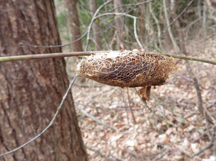春の訪れはゆっくりだけれど、暖かくなれば山の花は一斉に開きだすだろう。もちろんチョウやハチなどの昆虫も忙しくなる。珍しいサナギ(だと思う)を見つけたけれど、一体どんな昆虫だろう。網目の中にこげ茶の塊が眠っていて、長さは5、6センチもある。網目はゆりかごということだろうか。