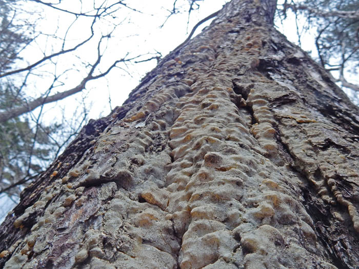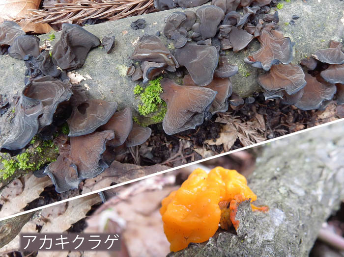 この季節は花もキノコも少ないけれど、倒れた木の影をのぞき込んでいるのは夫。粘菌の姿を見つけると嬉しそうだ。太い木の幹を覆い尽くすような蝋状のものは粘菌だろうか、それとも樹液?