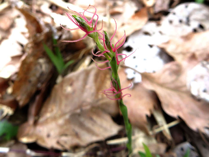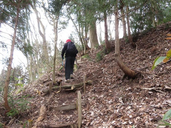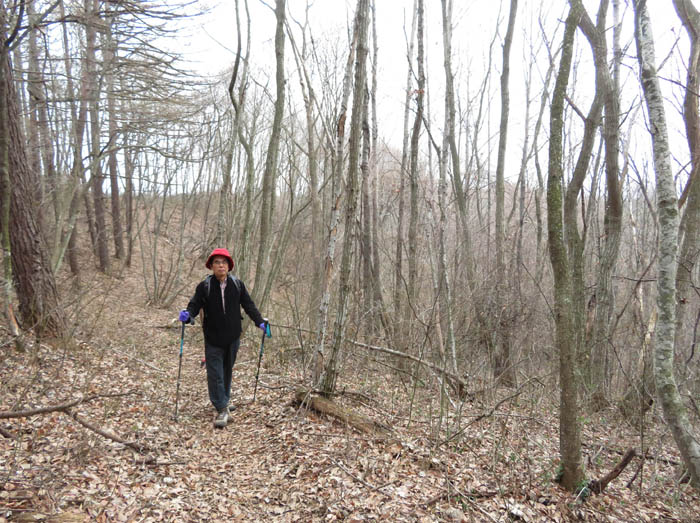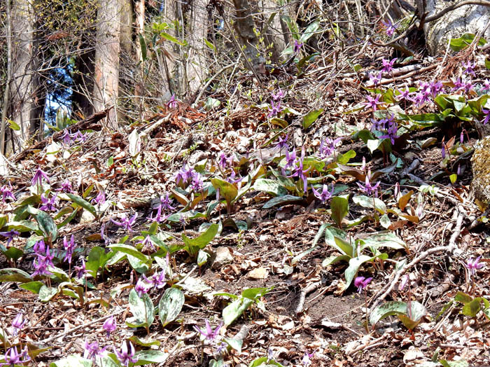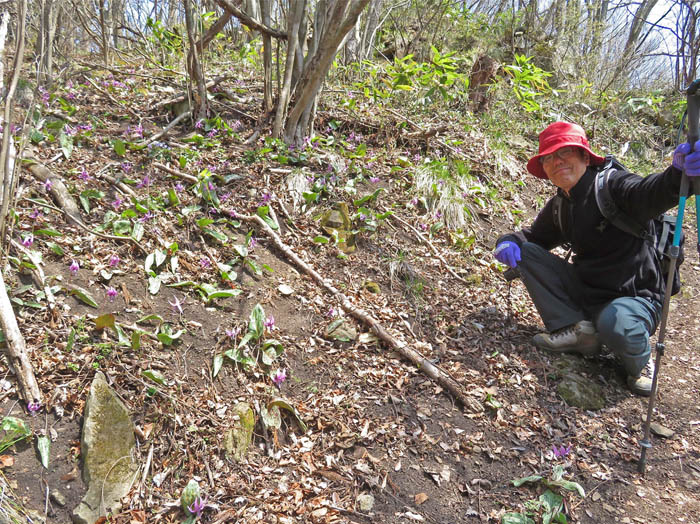 峠からの急な登りはわずかで、あとはとても丁寧に手入れされている歩きやすい登山道が続く。登ったり降りたりを繰り返すと、小広い鞍部に到着。どうやらカタクリの群生地らしく、葉がたくさん顔を出している。しかし、花はほとんど開いていない。よく見ると蕾がたくさん俯いているが、暗紅色で目立たない。ようやくピンク色の花を一輪見つけた。