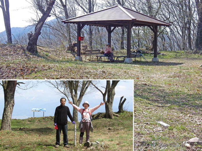 髻山への分岐につくと「カタクリを見てこようか」と夫。一登りで斜面が薄紫に染まっているカタクリ群生地、満開だ。山頂までカタクリ群落は続く。広い山頂の四阿でゆっくりおやつタイム。