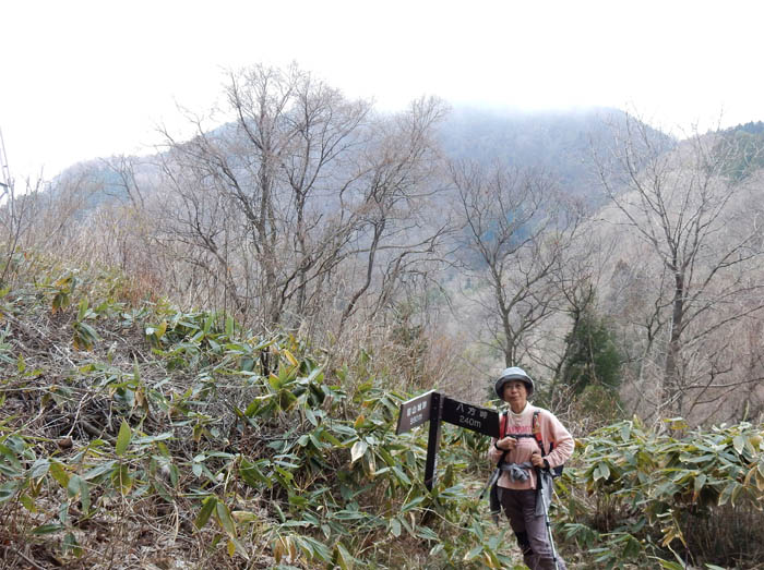 林道から八方峠までの道は緩やかな歩きやすい道、途中には北側の展望も開けて気持ち良い場所がある。だが、今日は雲が低く、遠くの山は見えない。森を進んで、谷の向こうに目指す三登山が姿を表したが、これまた山頂は雲の中。おまけに「なんだか滴があたる」と、夫が言う。滴も選んでいるのか、私には当たらないなぁ。