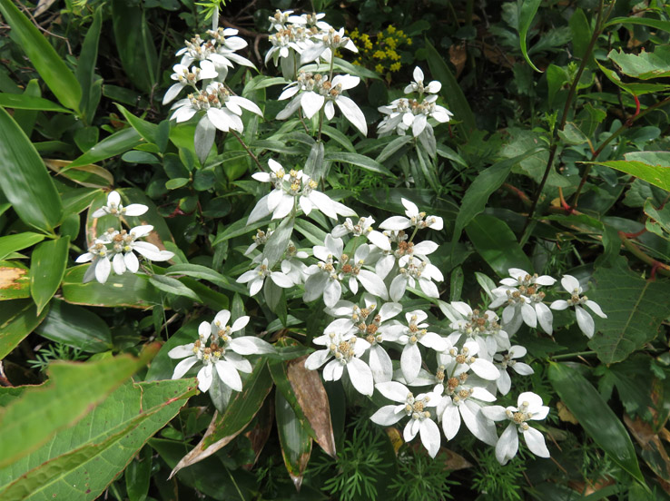 深い苔むした森の鞍部を越え、今度は登っていく。葉が波のようにさざめき、一面に白い花穂を揺らしているのはカニコウモリ。白い花の先が開きかかっている。大群落だ。