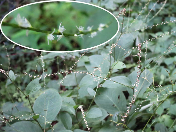 道の両側にはミズヒキが一面に揺れている。白い花穂のものが圧倒的に多い。薄いピンクの花も混ざっている。「ここのミズヒキ、ずいぶん色が薄いね」「大群落だ」と話しながら歩いていくと、真っ赤な花が出てきた。赤いミズヒキを見ると安心する。ミズヒキは一見真っ赤に見えるが、花が咲くと中に白い部分が光る。その紅白の姿が名前の由来だと言うから、やっぱり赤いのがミズヒキらしい。