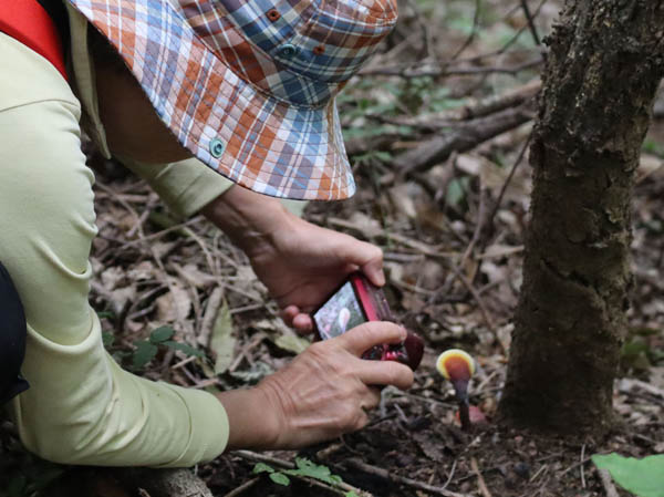 地附山公園の駐車場に車を停め、管理の西澤さんとやってきたイケさんと話をしているところに男性が登ってきた。男性はイケさんを見つけると嬉しそうに話しかけ、「一緒に歩いていいですか」と聞く。「好きにしなよ。でもゆっくりだよ」と答えたイケさんと私たちはいつもの道を歩き始める。その男性もイケさんからキノコのことを教わったそうで、私たちより詳しいようだ。私たちが草や木の様子を見ながらのんびり歩いている間に、男性は森の中にずんずん入って行ってきのこを探している。