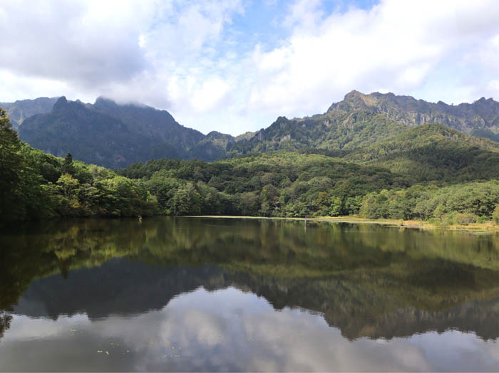 綺麗な実を見ながら、足取り軽く鏡池についた。空には雲が多いが、戸隠山についた陰影が山の奥行きを深く見せている。