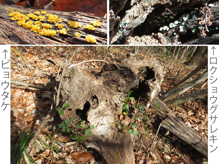 切り株の洞の中をのぞいてみると、ミツバの葉の匐枝(ふくし)が洞の中を伸びている。そして洞の奥にぽちぽち顔を出しているのはロクショウグサレキン、濃い青緑が綺麗なキノコだ。