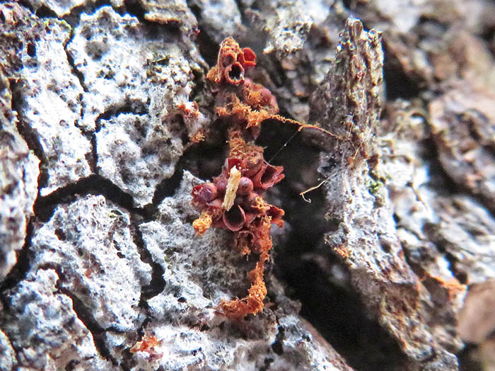 そこから少し道を進んでアカハシラホコリを見る。最初に見つけたときは可愛いハート型だったのだが、今は左上が割れている。どんなふうに胞子を飛ばすのか。