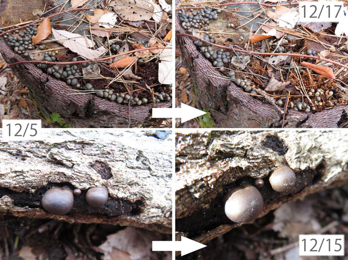 前方後円墳を越えていくと、切り株などにマメホコリがたくさん着いている。地附山にはマメホコリがたくさんあるが、マメホコリは松の木が好きなのだろうか。見つけやすい大きさのマメホコリだが、変化はあるかな。12月に入ってから3度目の観察になるが、よほどじっくり見ないと変化は分かりにくい。色が黒っぽく変わったような気がするが、光線の加減なのかもしれない。