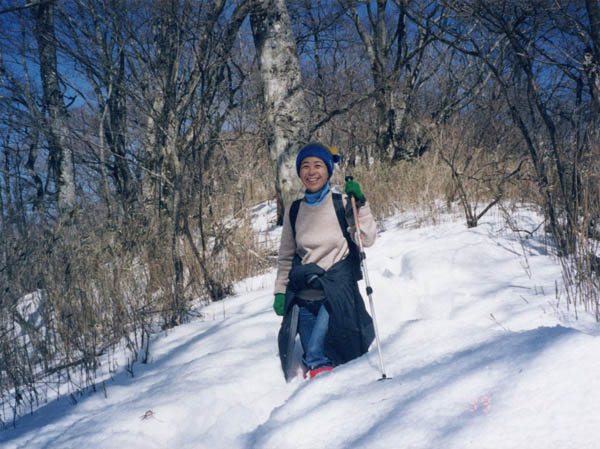 カバンからスパッツを出して取り付ける。なんとか急斜面を登りきり、少し広い稜線に出てきたので、はしゃいで雪の原を走ったりして遊ぶ。