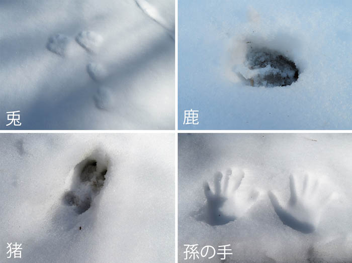雪面をよく見ていて、「これは何の足跡」と、見慣れない動物の跡を見つけると指差す。足跡は雪が溶けて鮮明ではないものが多いが、ウサギやイノシシ、シカなど、特徴がわかりやすいものはその動きが窺える。孫はすぐ覚えて、「あ、これはイノシシ。ここにいないかなぁ」などと呟きながら、足跡が消えていった谷の斜面を覗き込む。ウサギや、シカの足跡を見つけるとその特徴をちゃんと区別しながら、足跡を追ってどんどん先へ行く。