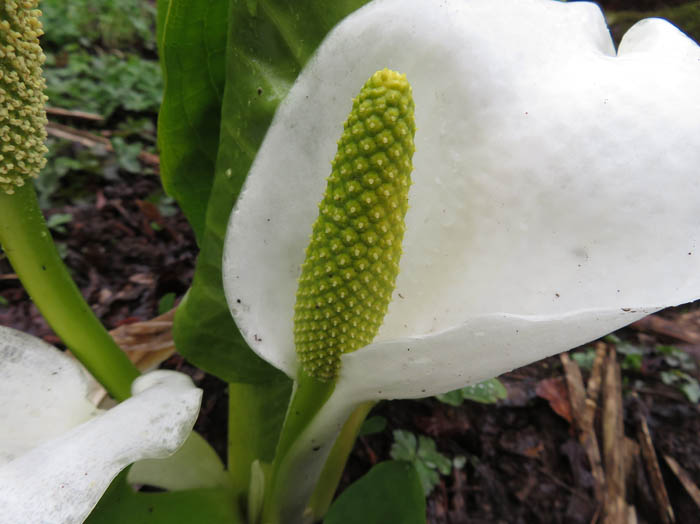 水芭蕉の花は、白い大きな苞に抱かれるように立っている花序にたくさんの花が集まっている。小さなつぶつぶに見えるのは綺麗に並んだピラミッド型の突起で、その一つ一つが花なんだそうだ。突起の周りの4面に小さな花びらがあり、その中にまず雌しべだけが出る。そして次第に雄しべが出てくるそうだ。気をつけて見てみるが、訪れた時にはおおかた雄花が成長してしまっている。今度は雌花の時を見たいと思いながらも、気がつくと最盛期になっていて、花は花粉をつけた雄性期になっている。