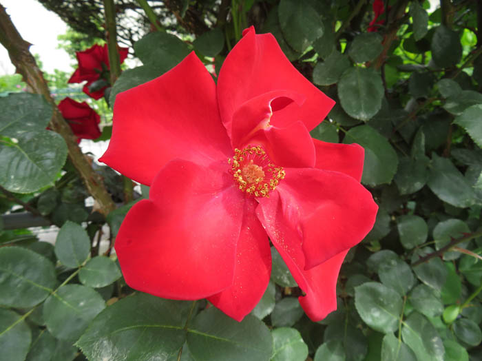 中野一本木公園には何度か訪れているが、今回が一番見頃かもしれない。それにしても種類が多い。木の根元には花の名前を示してあるが、あまりに多いので全部見ていくのは諦めた。園内には手入れの人が数人働いている。太い木の根元で、一人の男性が座り込み小鎌を持って何かしている。木の根元を削っているようだ。聞いてみたら、貝殻虫をとっているのだそう。樹皮の内側にも入り込んでいて、消毒液をかけても効かないから、一本一本手で取ってやるそうだ。木の根の周りを草が覆うとモグラが根をかじってしまうというから、根の周りは気をつけて見ていなければいけないようだ。我が家のバラも、友人の家のバラも根元には草が生えている、帰ったら手入れしようと話し合った。