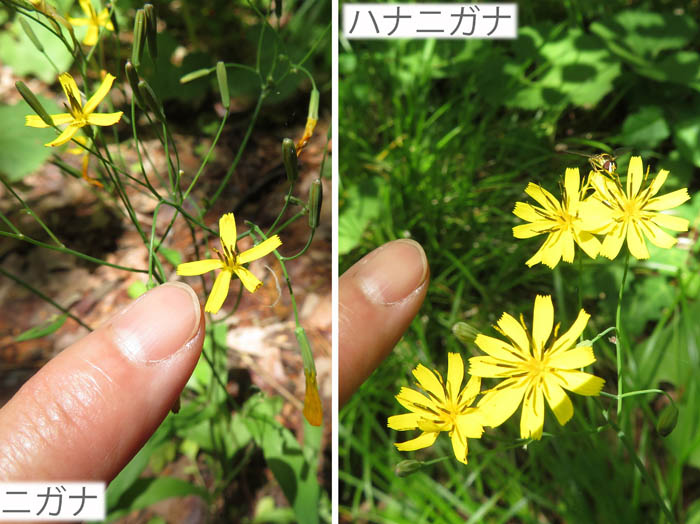 さて、山頂近くになるとハナニガナがめだってくる。こちらは明るい黄色、地面より高いところで揺れているから目立つ。「ニガナが母種みたいだよ。ニガナが変化してシロバナニガナになったんだって。そのシロバナニガナの1品種がハナニガナらしいよ」などと図鑑に書いてあったことを話していたら、ニガナの小さな群落があった。「これがニガナか」と夫。「確かに小さいね」。