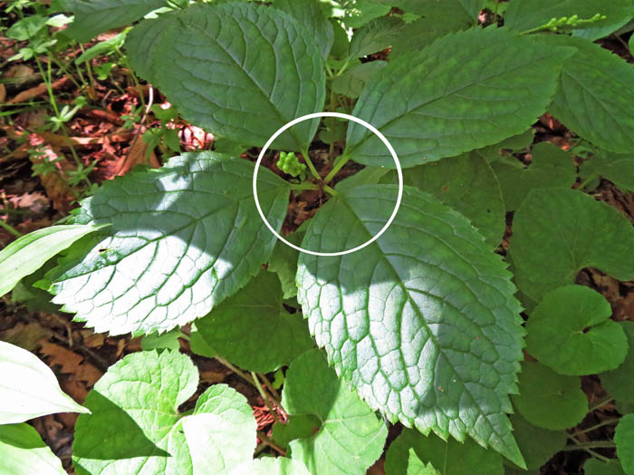 さて、水際から戻り、高巻きの道を行こう。湖畔を左回り(回る中心が左にある)に歩く。上り坂で池から少し離れるが、森の中の気持ち良い道だ。オオナルコユリの蕾がぶら下がっている、その下にはツクバネソウがたくさん咲いている。チゴユリやヒトリシズカ、エンレイソウなど春の花は実になっている。クモキリソウはまだ蕾だ。