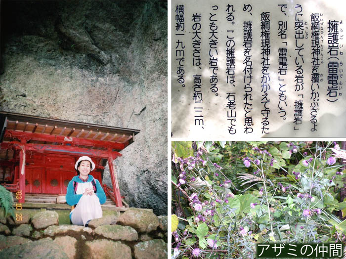 またここ石老山にも飯綱権現神社がある。この神社を覆うように守っている大きな岩は擁護岩。この岩は石老山の巨岩群の中でも最も大きいそうだ。高さは22m、横幅は19mと書いてある。石老山に登った20年前には飯綱権現と長野の飯縄山を結びつけて考えもせず、呑気に眺めて通り過ぎていた。先日久しぶりに高尾山に登り(※)、目が開かれた思いだった。長野市の北に聳える飯縄山への山岳信仰が発祥と考えられる飯綱権現は高尾山にも祀られていた。昔の人々の飯綱信仰が篤かったことを感じる。