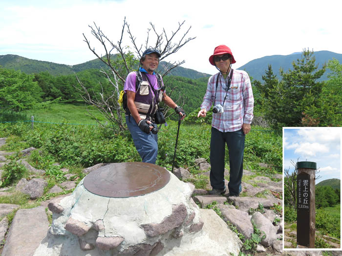 雲上の丘2110mに到着。空が青く、見晴らしが良い。方位盤があるので近づいていくと、時々言葉を交わしながら登ってきた男性が、「これを持ち上げたんですよ」と、ぽつり。もう20年も前になるかなぁ・・・と、懐かしそうだ。何人かの人が担ぎ上げてここに設置したのだそうだ。重かったでしょうと言うと、若かったから・・・とにこり。