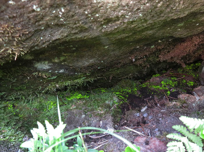 カラマツが倒れているが本来なら横に伸びている枝が全てまっすぐ上に伸びて元気に育っている。倒れた根は半分土の中に残っているが、半分は空中に浮いている。「すごいね」と言いながら見ていると、後ろから来た男性が「根性松というんですよ」話しかけてきた。倒れても頑張っているからだそう。