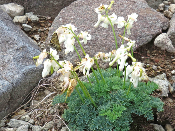 さて、コマクサを見に行こうか。平日でも人が多いのはアクセスの良さとコマクサの人気らしい。シロバナコマクサはちょっと枯れてきて黄ばんでしまったけれど、まだ綺麗な花もあり、小さな蝶がやってきていた。