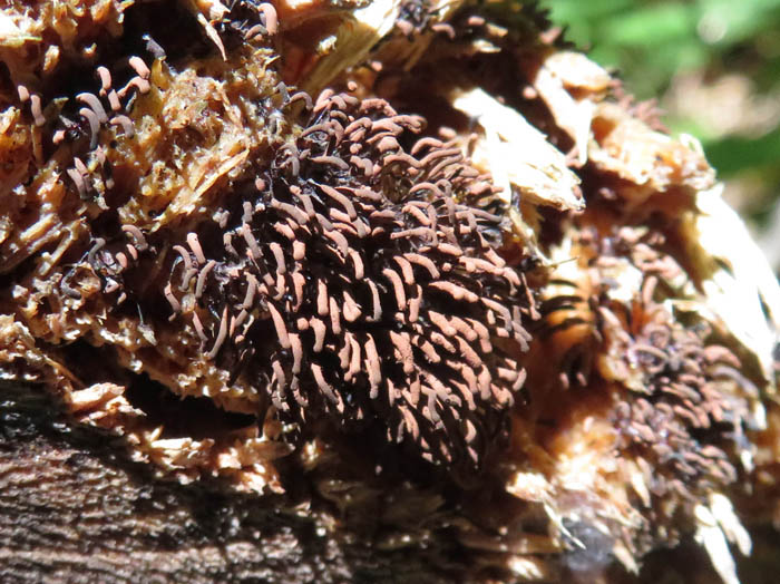 しばらく写真を見て話をしてから歩き出す。やっぱり実物を見るのが一番だ。私たちは雨が降ったからキノコもちょっとは見つけられるんじゃないかとやってきたが、「雨の後パッと晴れないとダメ」とキノコ博士は言う。まずは先日イケさんが見つけたというムラサキホコリの仲間を見に行こう。体長の長いふわふわした毛のようなものが木の幹に生えている。スカシムラサキホコリではないかと夫が言う。粘菌はキノコや苔が生えてくるような朽木に多く見られるが、生木にも生育することを初めて知った。急な斜面なので、立木につかまりながら撮影する。