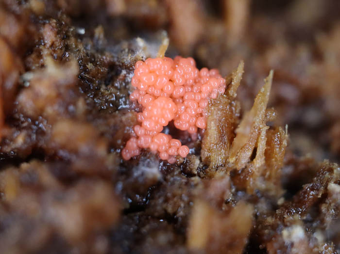 いつも歩いている道だが、雨が降ったからか粘菌の未熟子実体がたくさん顔を出している。まるでイクラのように広がっているものもある。