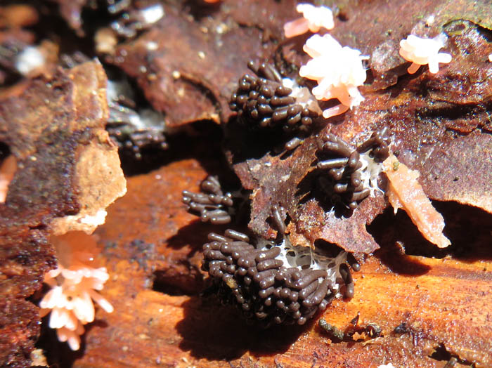 こうなると進むペースはどんどん鈍くなる。立ったり座ったり、倒木を跨いだり、藪の中に分け入ったり。長く黒い柄に小さな玉がくついているのが木肌一面に広がっているところもたくさんある。これはアミホコリの仲間か、クモノスホコリの仲間か、とにかく多い。