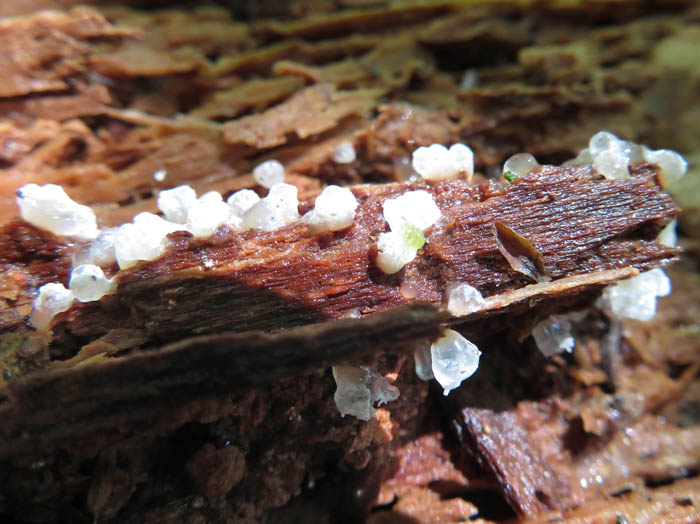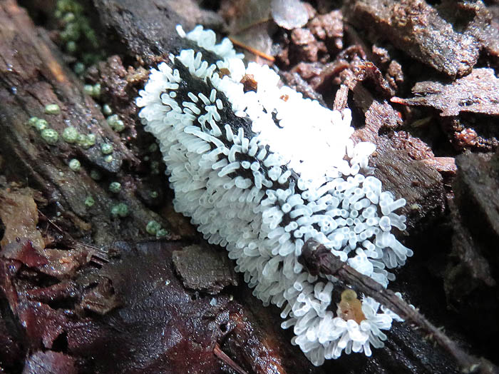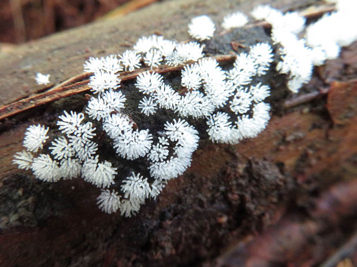 このヘビヌカホコリを見るとなぜか私はドイツのパン、プレッツェルを思い出してしまう。それは余談だが、ぬかるんだ道を登りながら脇に倒れている太い木の幹をのぞき込むとどこにも粘菌が活躍しているではないか。ツノホコリやタマツノホコリの純白な輝きがたくさんある。そしてまだ形にならないような灰色がかったものが白く変化していく様子なども見られる。