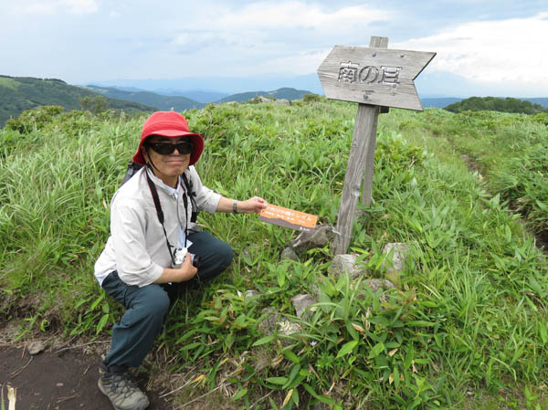 さて、話を戻そう。乗越からの道は、高低差はなく気持ち良い草原の中の道だ。すぐ近くに蓼科山と八ヶ岳が並んで見えている。少し歩くと道は別れる。左に進むと南の耳に至るらしい。中央分水嶺トレイルの小さな看板が申し訳なさそうに草に埋もれている。ここから先は下りになるようだ。どんどん雲が増えてきて雨の匂いがするようになったので、今日はここまでとしよう。