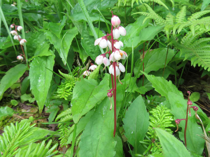 ゲレンデの脇は笹原になっているようだ。笹の上に伸びたナナカマドの葉がもう赤く色づいている。笹の根元にはベニバナイチヤクソウがたくさん咲いている。シロバナのベニバナイチヤクソウなのか、白や淡い色を乗せた花もたくさんある。最盛期はすでに過ぎて結実期に入ってきたところか。