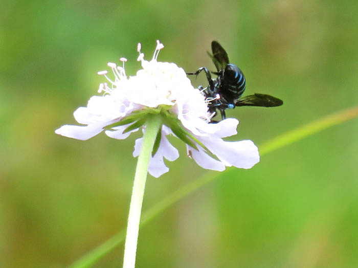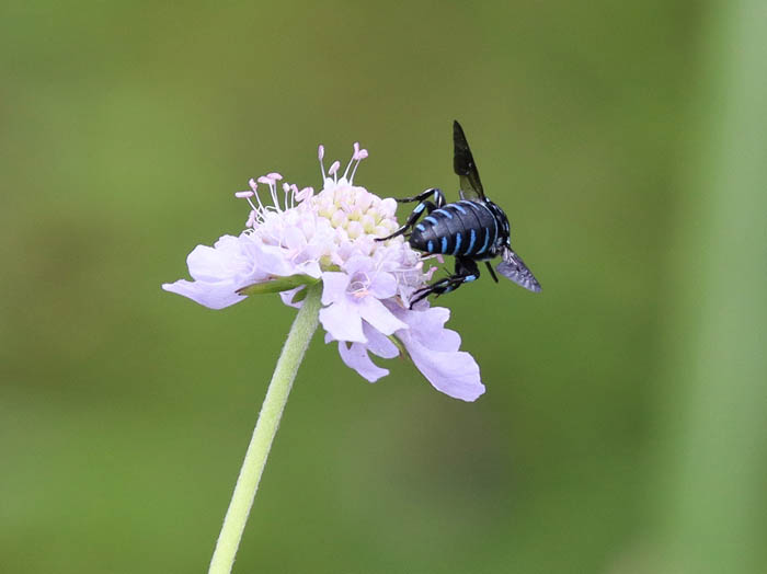 イケさんも合流して、珍しく賑やかな裏山歩きになった。山頂に着くと青いハチを探す。シオカラトンボや、ヒョウモンチョウは飛んでいるが・・・。眺めているとツマグロヒョウモンが交尾している。羽の先が黒く美しいメスがオスをぶら下げるようにして飛んでいる。時々木の葉に止まってはまたひらりと浮く。そんなヒョウモンを眺めていると目の端をヒュッと何かが掠めた。きた。ルリモンハナバチ、幸せを呼ぶという青いハチ。まだ開いた花が少ないマツムシソウを巡ってあっちに飛び、こっちに飛び、忙しそうだ。