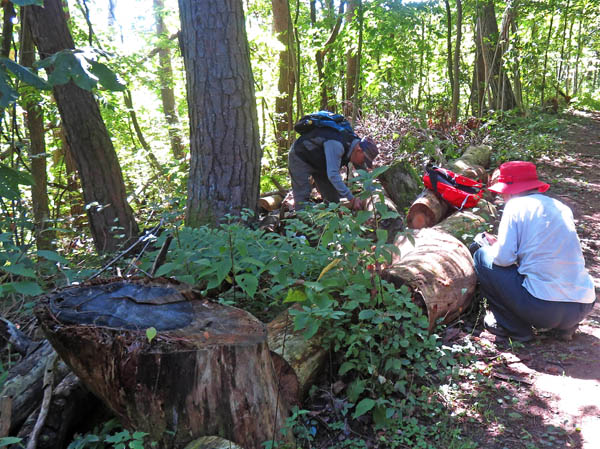森の中に太い丸太が並んでいるところで腰を下ろして一休み。登山道の上に倒れかかっていたこの木を切り倒して整備したのはイケさんとその仲間だ。二人だけで作業していたのを見ているが、大変な労力だ。