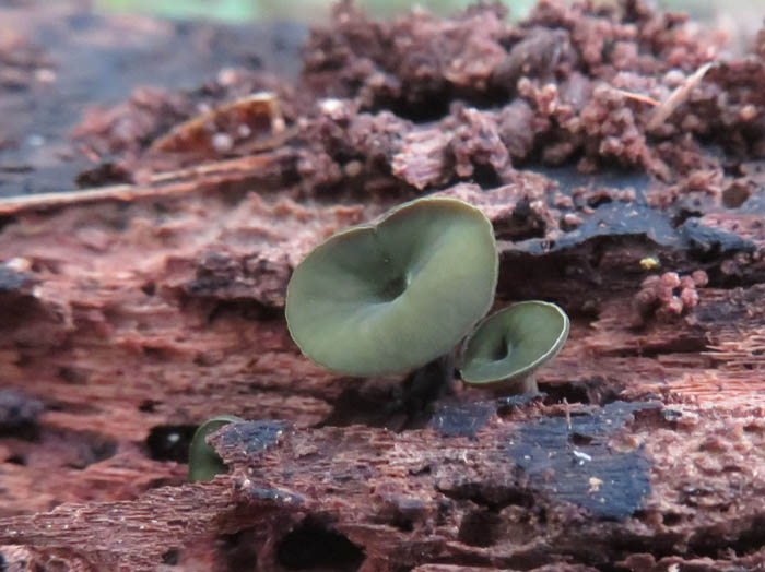 イケさんと情報を交換しながら森の中を歩くうちに、少しずつ粘菌が近くなってきたような気がする。たった1日経っただけでも変化していることがある粘菌は、なかなか見たい姿を見せてくれない。夫もイケさんも未熟子実体を見たいと言っている。半透明に輝く姿は美しいのだが、変化が早いのでなかなか目にすることができない。気がつくと胞子を飛ばし始めている。7日に見つけた光る粘菌は、胞子を飛ばし始めてくすんだものもあったが、まだ光っている個体もあった。