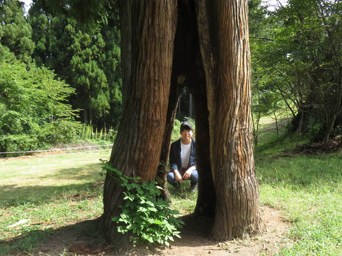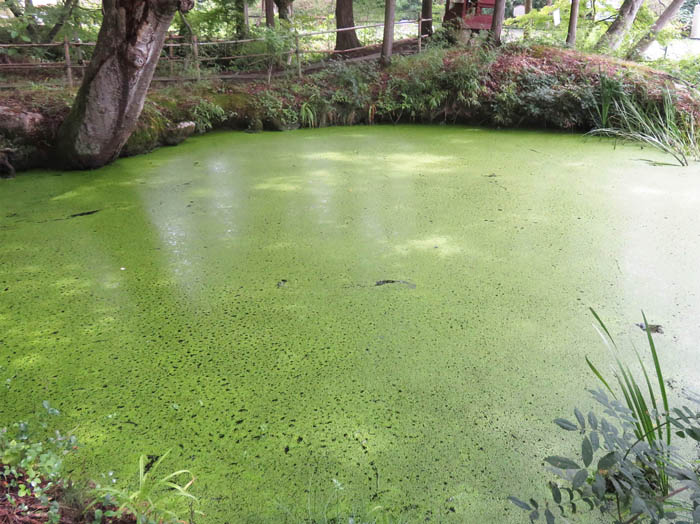 それより、入り口脇にある小さな池が神秘的だ。池はいくつかあるがどれも小さなウキクサに覆われて、その葉が太陽光を受けて緑色に光っている。ここにはクロサンショウウオが生息するそうだ。小さなウキクサの葉が綺麗なので近づいていったら、ポチャンと音がした。ウキクサが割れて黒い水色が出るが、わずかに波の広がりを見せてまた緑に覆われる。「あ、あれはきっとカエル」「ずいぶん大きかったんじゃない」などと話していると、またボチャン。今度は近い。