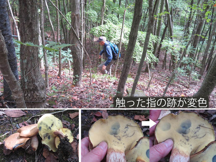 イケさんは名人の目で急な斜面の下の方にあるキノコも見つけてしまう。