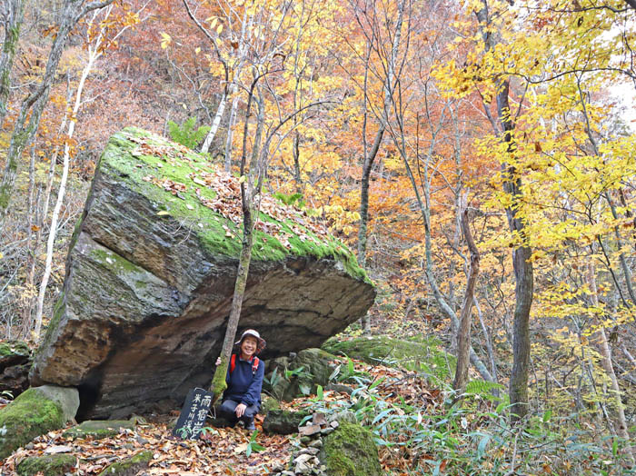 流れが洗う大きな岩は赤く染まっている。鉄分が多いのだろうか。上には昔硫黄などを採取する鉱山があったというが。さらにしばらく登ると大きな岩が斜めに立っている。雨宿岩と標識が出ている。修験者が雨を凌いだと言われているそうだが、頭の上に巨大な岩が覆い被さっているので、落ちてきそうだ。入ってみたけれど落ち着かない。さすがに修験者は肝が据わっていたのだろうか。