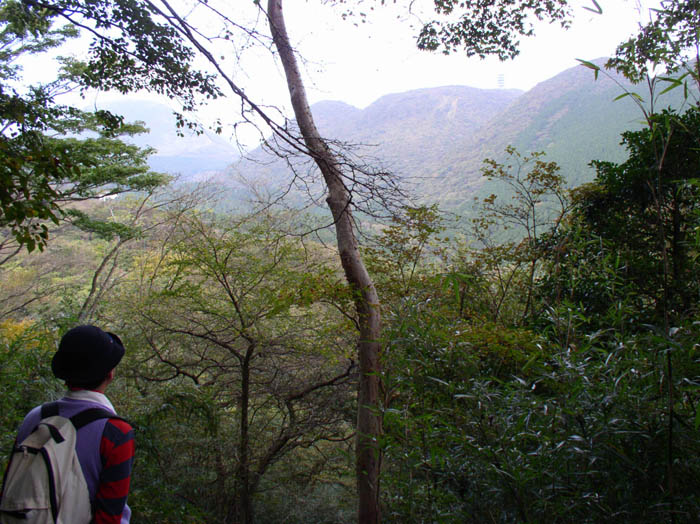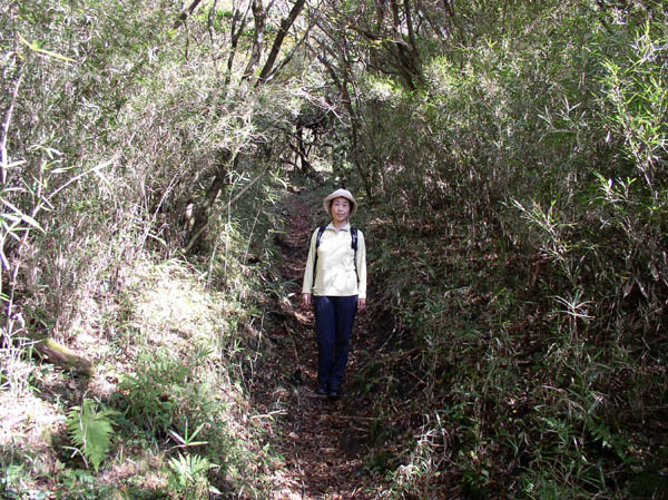 お腹を満たして、さらにひとのぼり。細い笹竹が密集して生えている中に道は続いている。芦ノ湖のすぐ近く、観光道路のすぐ隣の山なのに、なかなか趣がある道が続く。