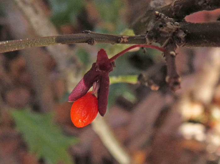 ところどころに真っ赤な木の実が光っていて目を惹かれる。ミヤマガマズミとコバノガマズミ、そしてちょっと大きめのサルトリイバラ。ほとんど葉が残っていないので、実だけが宝石のように高みにある。