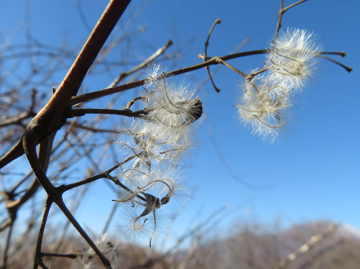 頭の上にはベニサラサドウダンの実がたくさんぶら下がっている。ムラサキシキブの実も色褪せながらまだたくさん残っている。茶色の世界の真ん中に座ってお昼にしよう。夫は軽井沢駅で買ってきた玄米弁当を開ける。久しぶりの味に笑顔がこぼれる。日差しはポカポカ、人の声はなく、時々小鳥の声がする。