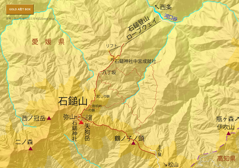私の記憶では『西条駅からロープウェイに乗って』、そこから何度もアップダウンを繰り返して鎖場に取り付いたのだが、今調べると正確には伊予西条駅というらしい。そして、ロープウェイの先にリフトもあって、さらに高度を稼げるようだ。ロープウェイ山頂駅から少し歩くと石鎚神社中宮成就社(1450m)に着く。