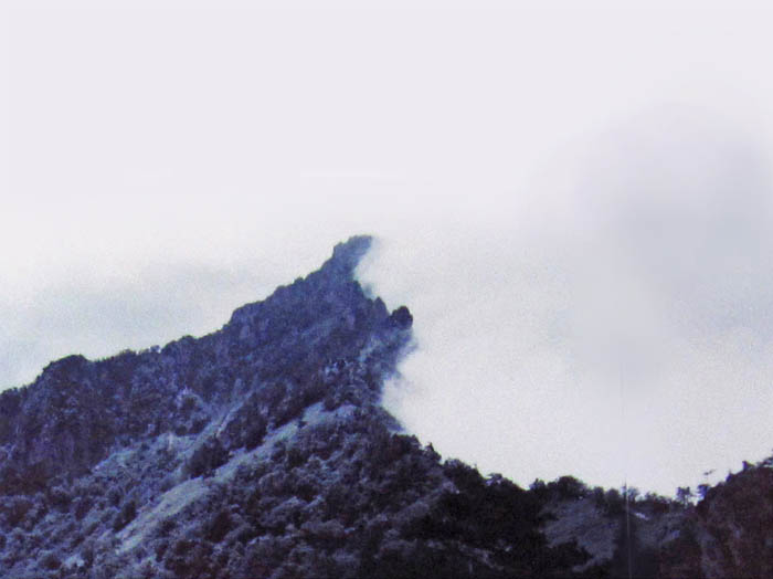 弥山から、山頂の天狗岳への登りは急峻な岩場だった。台風が近づいているためか、高知側から絶えず濃霧が噴き上げていた。崖の下が見えないから、怖くなくて良かったかも?