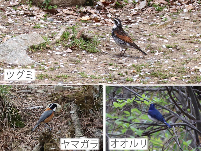 いろいろな桜があることに驚きながら山道を歩き始める。ソメイヨシノの花びらが吹雪になって道に舞っている。道は白い花びらの絨毯になっている。池を見下ろしたり、葉桜の梢を見上げたりしながら登っていくと、青い鳥が目の前を横切った。時々羽ばたきをするように羽を広げてからまた枝に止まる。春の芽吹きの枝の向こうにいるので写真は上手く撮れないけれど、あれはオオルリだろう。綺麗な濃いブルーの背中と真っ白な腹が綺麗な鳥だ。