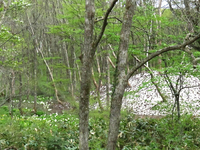 また話がそれた。観察会の参加者は鳥に詳しい男性以外はみんな女性。花に詳しい松本からの参加者もいて、やはり戸隠の人気は大きいみたいだ。みどりが池には大きなハルニレの木が倒れ込んでいた。鳥に詳しい男性によると、昨日はそこに作りかけの浮巣があったそうだが、今日は見当たらなくなっていたとか。自然の世界は厳しいのだろう。池のほとりの水芭蕉は白い苞が倒れて、緑の葉が大きくなってきた。植物園の入り口辺りには雪の山が残っていて、水芭蕉もまだいくらか白さを残していたが。