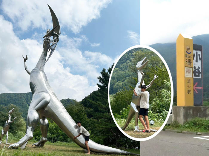 道の駅小谷で休憩、美味しい釜炊きのご飯で昼食。隣接する災害復興公園には大きな恐竜モニュメントがあった。豪雨で姫川流域に発生した土石流で大きな被害があった小谷村。その災害からの復興記念がなぜ恐竜かというと、小谷村は日本最古の恐竜の足跡が発見されたところだそう。