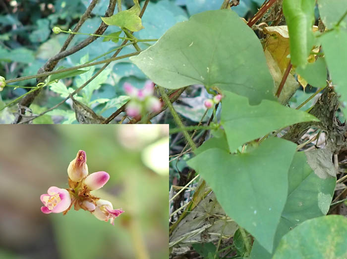 私の目的はサルナシの実。まだちょっと早いかな、でも味見くらいはできるかな。以前実をつけていた木は枝が落ちてしまった。かろうじて手が届くところを何度か見てきたが、雄花だけが咲いていたようだ。雌花を見つけられなかったが、高いところにはあったかもしれないと、今日は夫と二人で目を凝らしてみるが、実は見つけられなかった。
