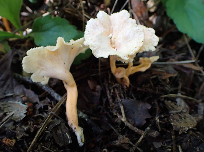 数日後、センブリやウメバチソウの変化を見ようと再び地附山に登った。先日あっちこっちに出ていたキノコの写真を撮らなかったので、今日は撮って帰って調べよう。あるある、今日もあっちこっちにまとまって出ている。もうカサが崩れそうなのや、地面を盛り上げて顔を出してきたのやら、たくさん出ている。色はオレンジ色、クリーム色、ほとんど白のものまである。裏を見るとカサの部分のヒダがはっきりしないからこのキノコはトキイロラッパタケだろう。