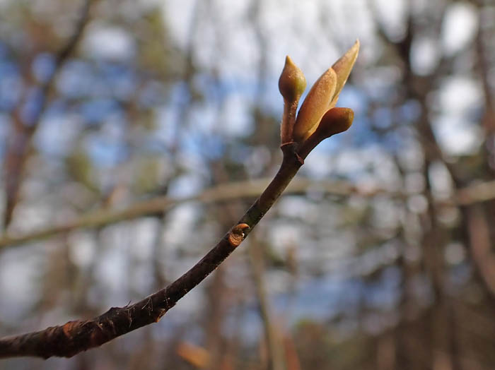 まず、駒弓神社から登り始める。8時半頃なのにもう降りてくる人に会う。日曜日だからお休みの楽しみに登る人が多いのかも知れない。登りながら近くの倒木の下などをのぞき見ていくが、粘菌には会えない。草や木の葉は枯れて茶色になっているが、苔が緑で綺麗だ。ヤマツツジがポツリポツリと狂い咲きしているけれど、寒暖の差が大きいこの頃、木々も迷うのかも知れない。枝の先には茶色く枯れた大きな春の葉があり、先端に小さな緑の秋の葉が冬芽を囲んでいる。