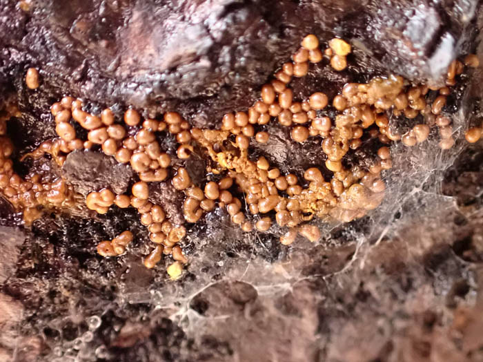 さて下山はどうしようかと思いながら歌ヶ丘への道を降り始めると、いた。粘菌。急斜面の足場が悪いところに横たわる木、その剥がれかかった皮の中にびっしり。ヘビヌカホコリはそろそろ終盤らしい。そして茶色のヌカホコリのような粒々がいっぱいだ。夫へのお土産に写真を撮る。後で夫に見せたら、フタナワケホコリと分かった。