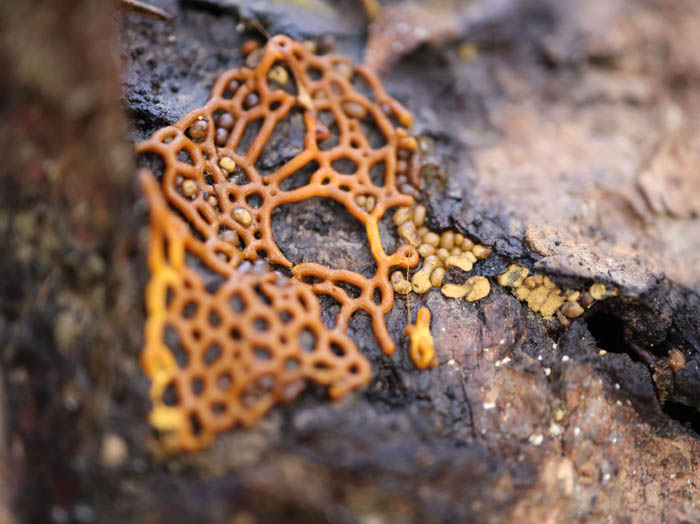 落ち葉が湿って滑りやすい車道を降りて、先日の粘菌を見つける。日も当たらない北側だからか大きな変化はないみたいだ。粘菌もアラゲコベニチャワンタケもそのままそこにいるようだ。急斜面の途中に横たわっている倒木なので、あまり近づいてゆっくり撮影することはできない。枯れ木にしがみついて登り、なんとか一部を撮影。