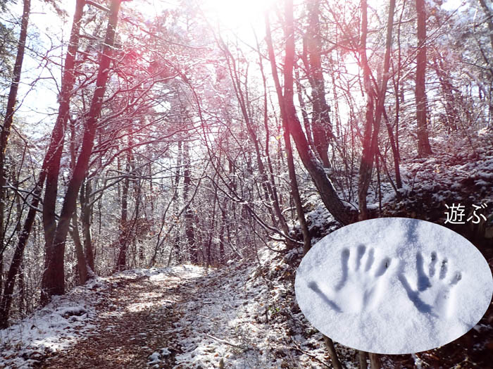 今年の初雪山だと、積もった雪に手形を押して遊ぶ。暖かいところに住む子供達が長野に来ると、雪景色の中で家族の手形を並べて喜ぶ。今日は夫と二人で、子供たち家族の真似をしてみた。たった二つの手形はさびしいね、まぁいいか。